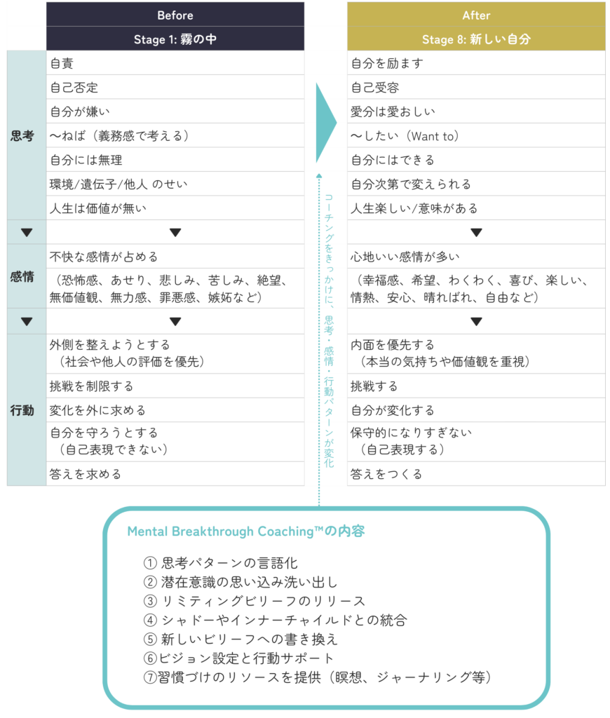 セッションを重ねることで、思考、感情、行動、すべてのレベルで変容を起こします。